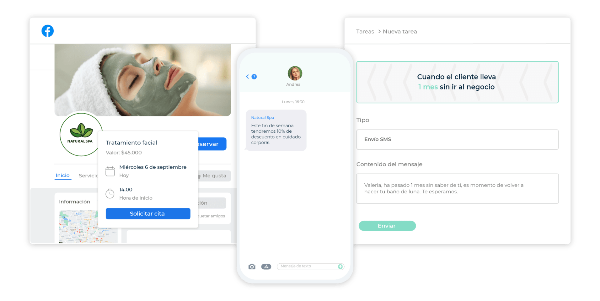 Conéctate con tus clientes, segmenta, envía mensajes de texto y automatiza recordatorios de citas para acercarte más a ellos y promover tus servicios. ¡Muy fácil!