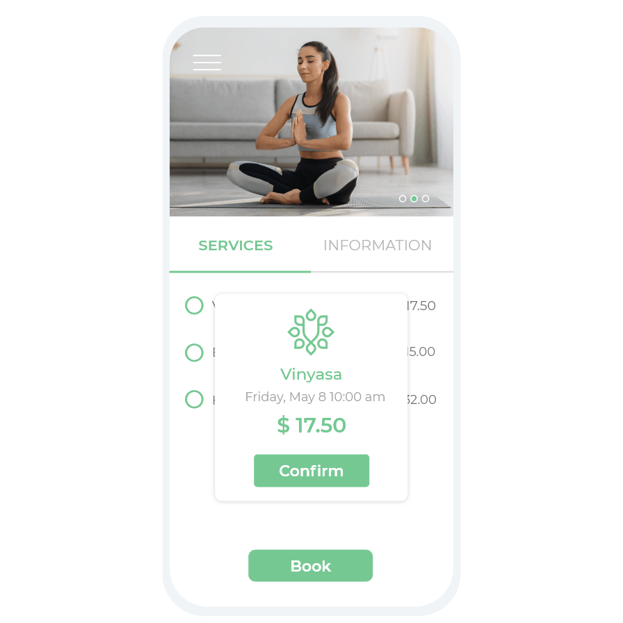 a tus sesiones de yoga online. Transmite clases grupales o privadas desde el mismo sistema desde el cual llevas el control de tu negocio.