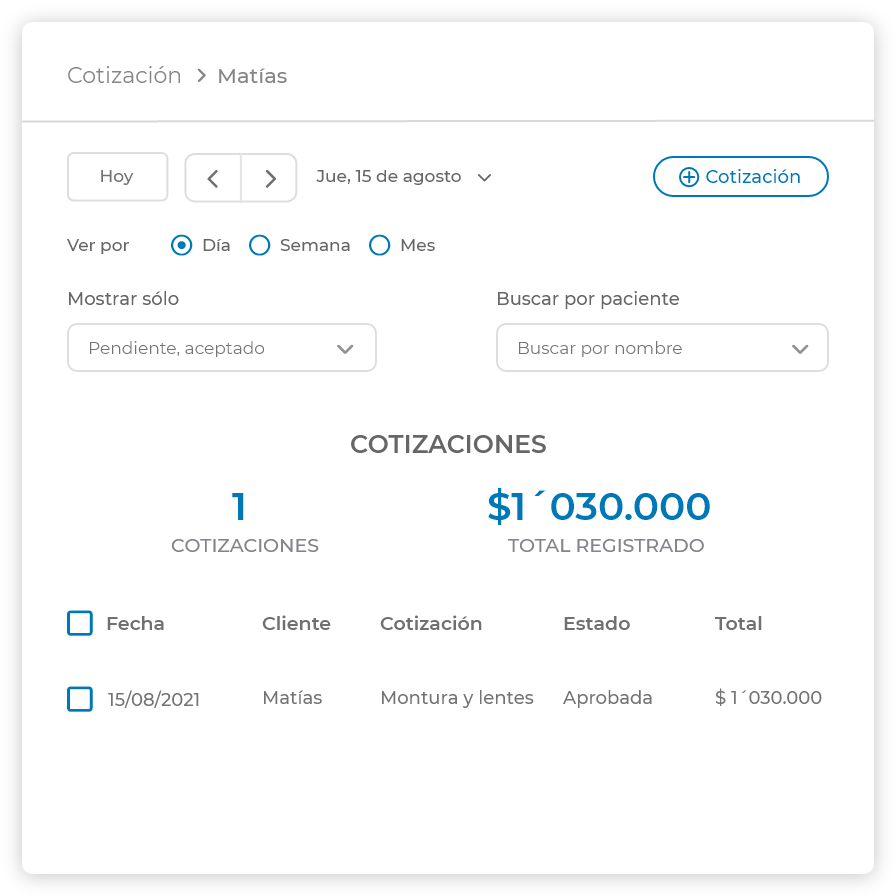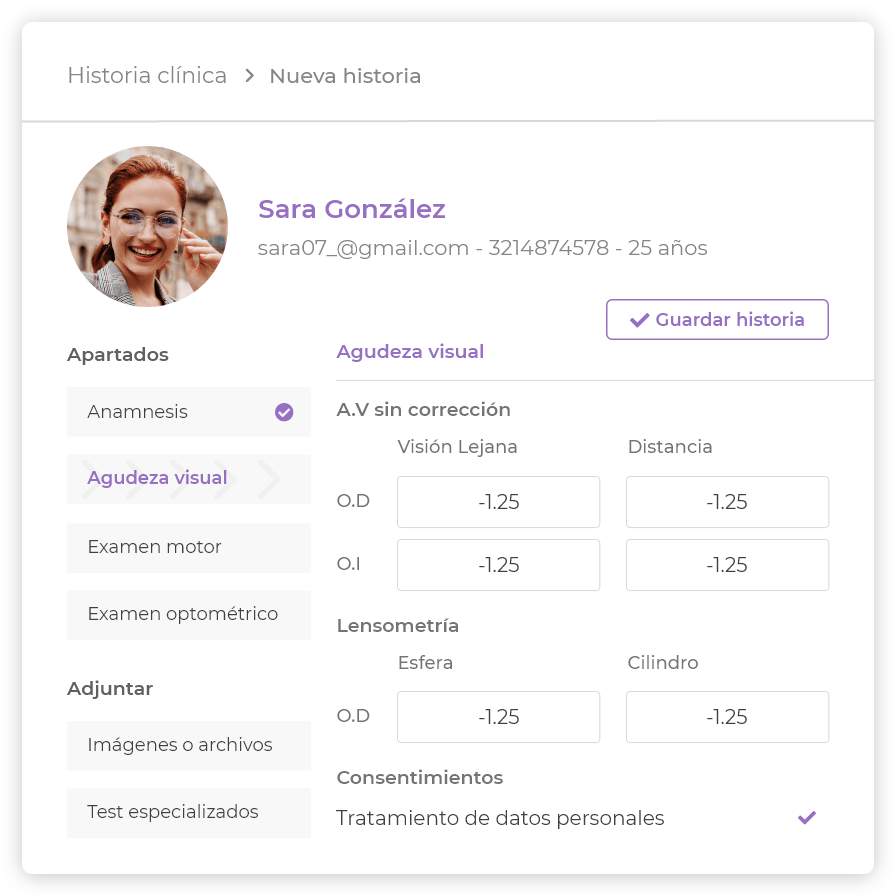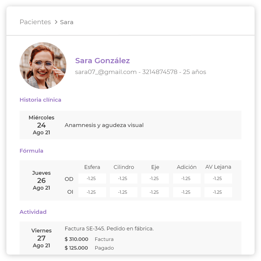 - Controla el registro y lleva el detalle de las compras de cada paciente en su ficha, la graduación de sus lentes y algunos datos más que te permiten conocerlos y mejorar su experiencia.