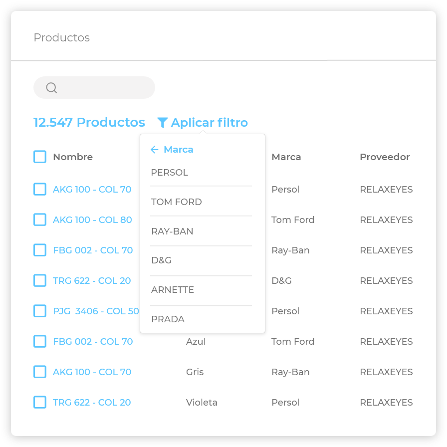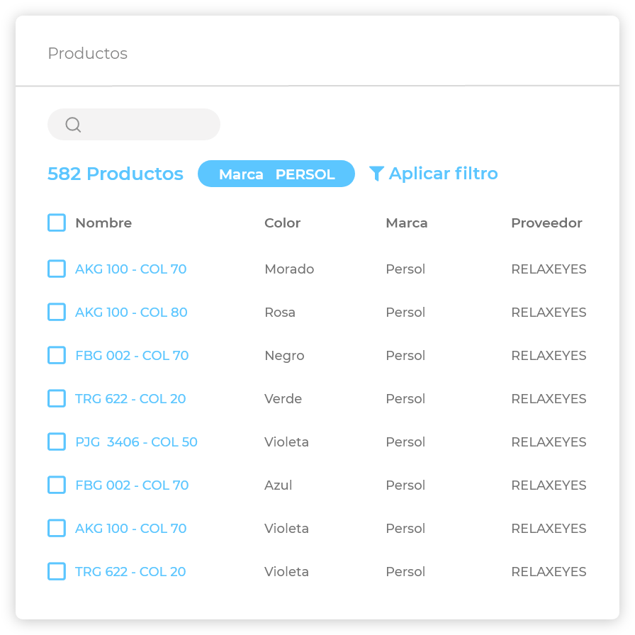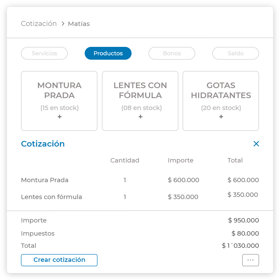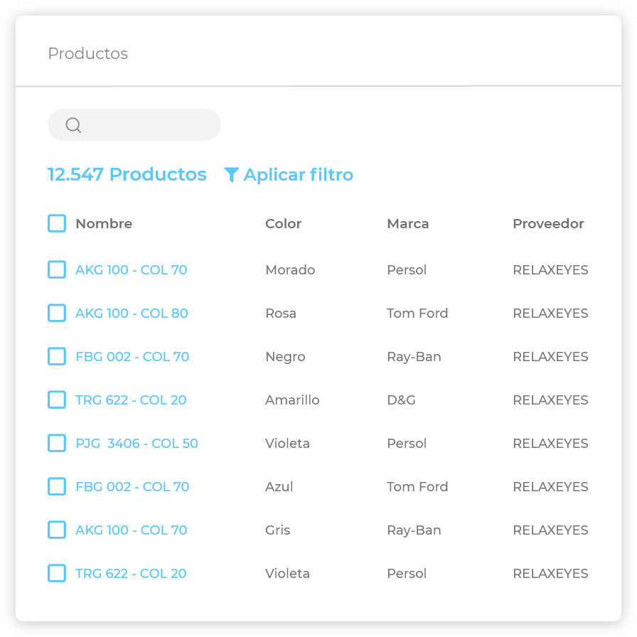 - Importa y conecta el catálogo de productos con los proveedores de monturas y lentes en el sistema.